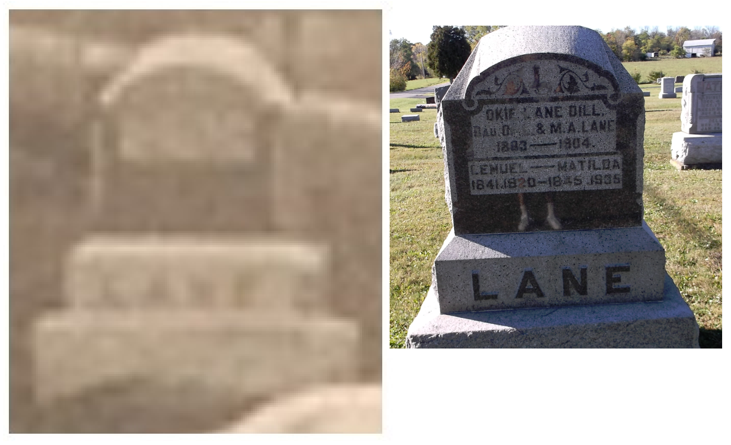 The image in the old photo of the stone for 'LANE' is given below (left) with the photo that was taken in recent years of the stone for ‘LANE’ at the East Liberty Cemetery in East Liberty, Ohio (right):