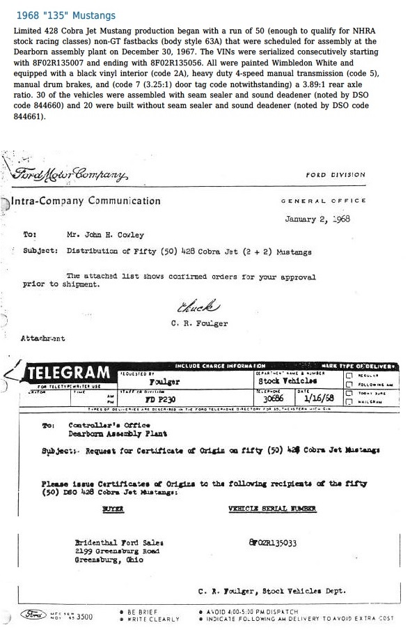 Portions of interesting information about this particular vehicle (VIN: 8F02R135033) being one of the first fifty 1968 Ford Cobra Jet Mustangs produced (VINs: 8F02R135007 to 8F02R135056) follow as acquired from the Mustang 428 Cobra Jet Registry: