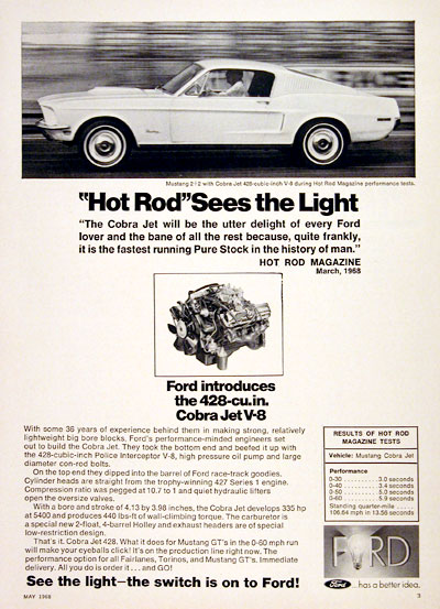 The May 1968 issue of Hot Rod magazine included the advertisement below for 1968 Ford Cobra Jet Mustangs: