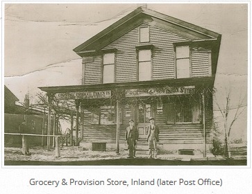 the building and surrounding terrain in the Inland Store and Post Office Post Card below,