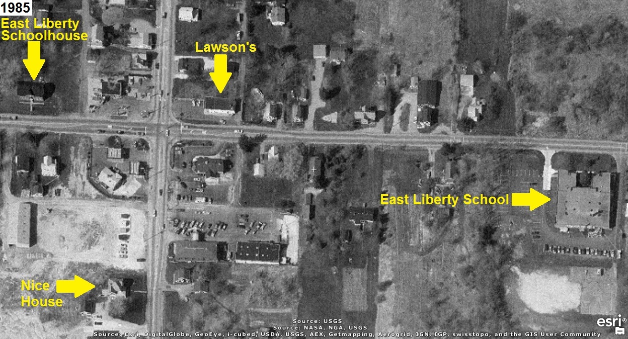 A building in each quadrant is identified in the 1985 aerial photo below: