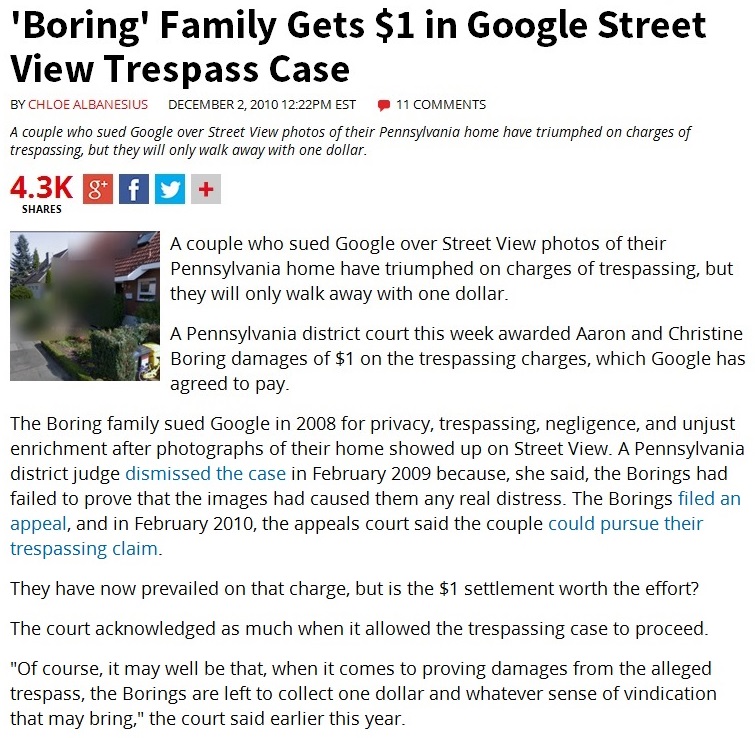 'Boring' Family Gets $1 in Google Street View Trespass Case