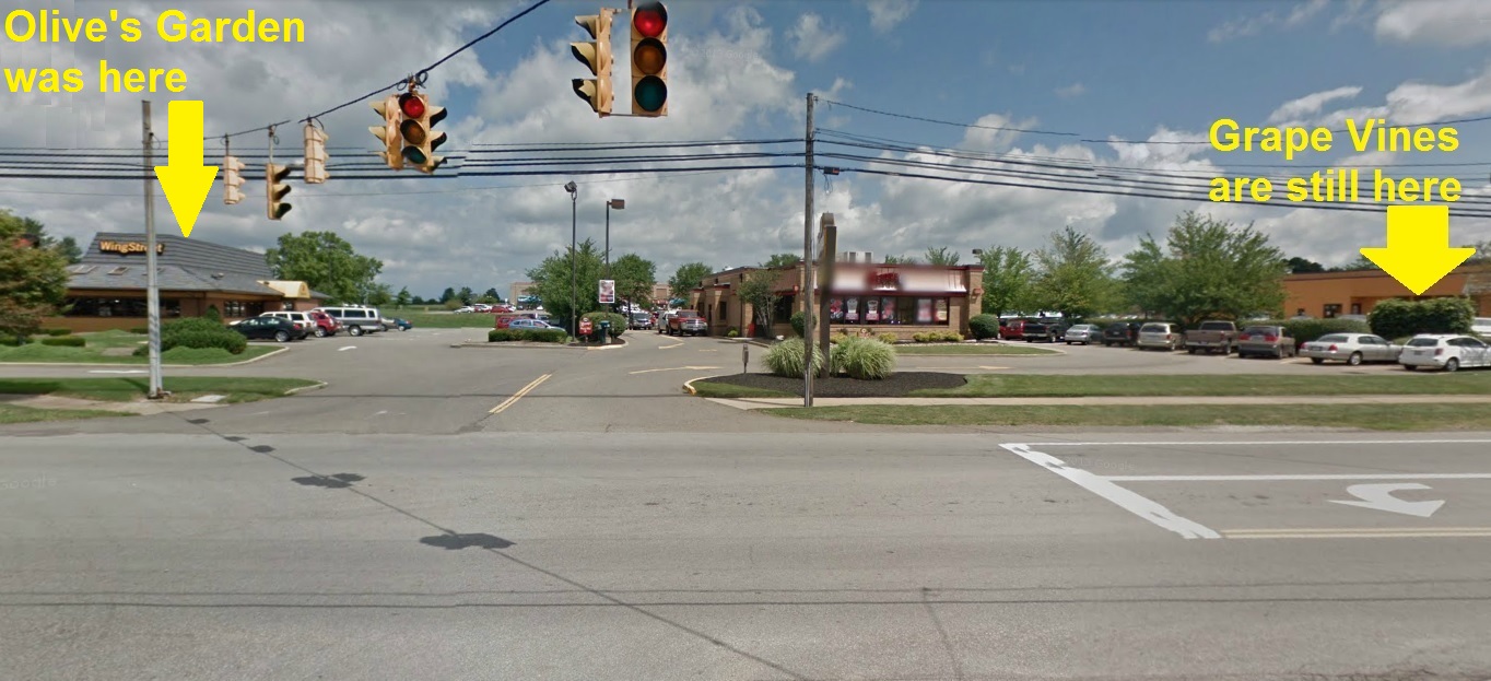 Also, the northwest corner of the Pizza Hut building is exactly in the middle of Olive's Garden.