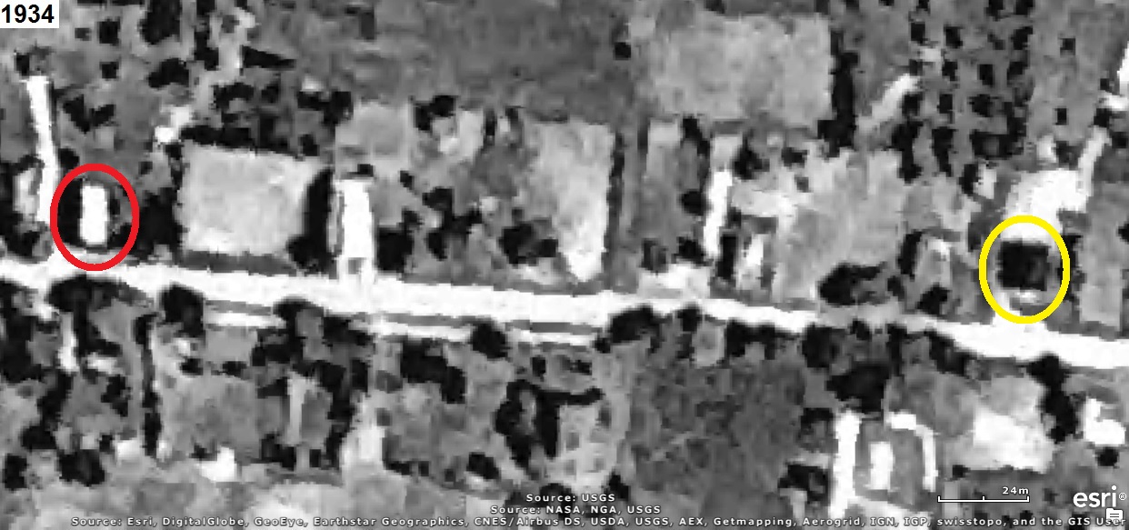 The aerial photo below from 1934 includes a yellow circle (right) around the building in question and