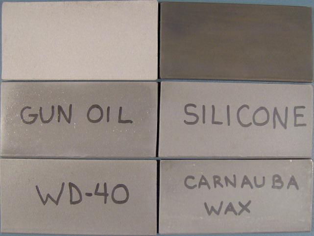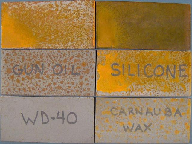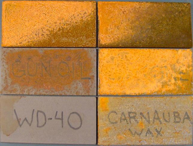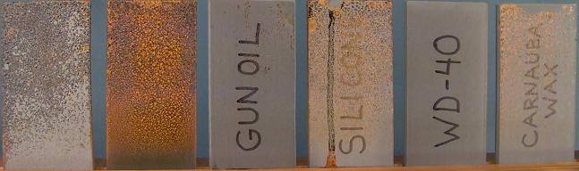 The photo below shows 2" by 4" by 1/4" pieces of steel that have been sandblasted and marked with the name of the product used to prevent rust. The top left piece is bare steel and the top right piece has had 3 applications of Paste Gun Blue: